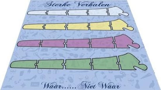 Sterke verhalen: Waar of niet waar is een bordspel voor 5 spelers, waarin je elkaar bij de neus neemt. Vertel elkaar sterke verhalen en laat de anderen oordelen of het verhaal waar is of dat je het ter plekke verzint. Hoe meer spelers je bij de neus neemt, hoe langer je eigen neus wordt. Degene die als eerste een lange neus heeft, wint het spel.