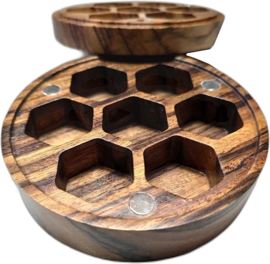 Premium kwaliteit houten opbergdoosje voor 7 dobbelstenen. Gemaakt van fraai afgewerkt hout in de kleur ‘Zebra Wood’. Door de sterkte magneetsluiting blijven de dobbelstenen goed in het doosje zitten.