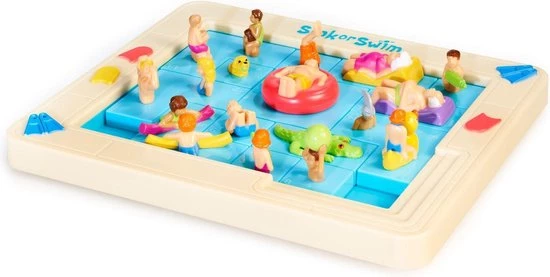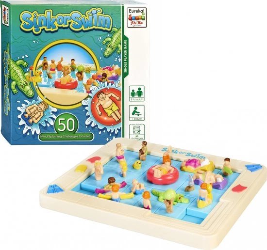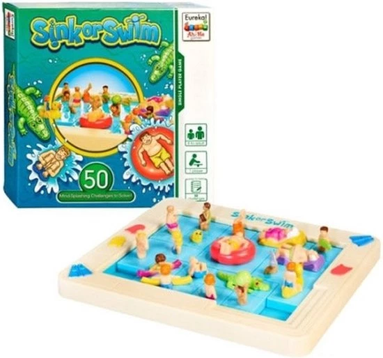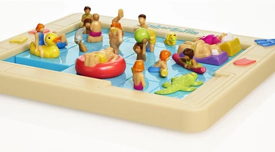 Denkpuzzel van Eureka!. Help de jongen in de rode zwemband om uit het zwembad te komen. Hiervoor moet je puzzelstukken schuiven.