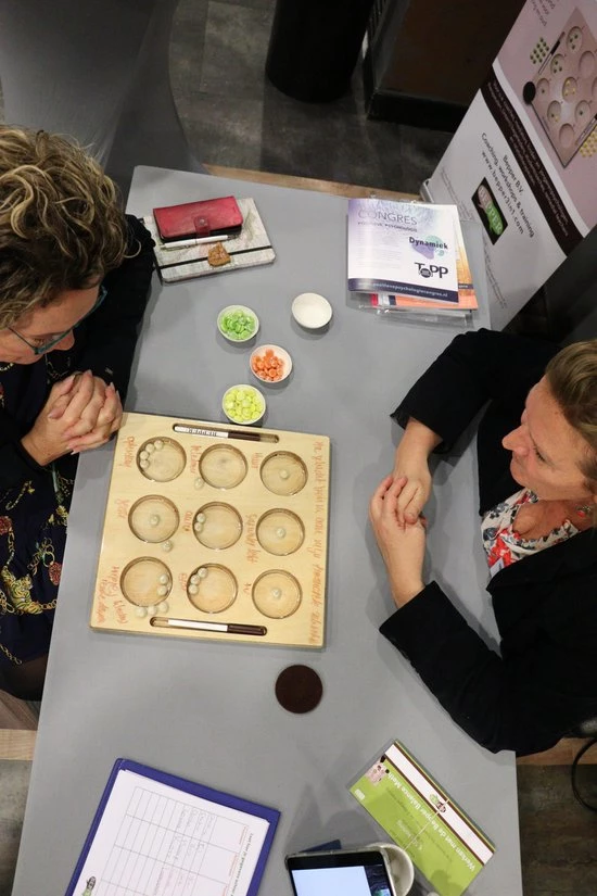 Dit Bepper Bord van massief hout, is herschrijfbaar met whiteboard markers en degelijk en luxe uitgevoerd. Het bevat ver zakjes met gekleurde ‘gems’ en ander materiaal dat nodig is voor het toepassen van de coaching methode.