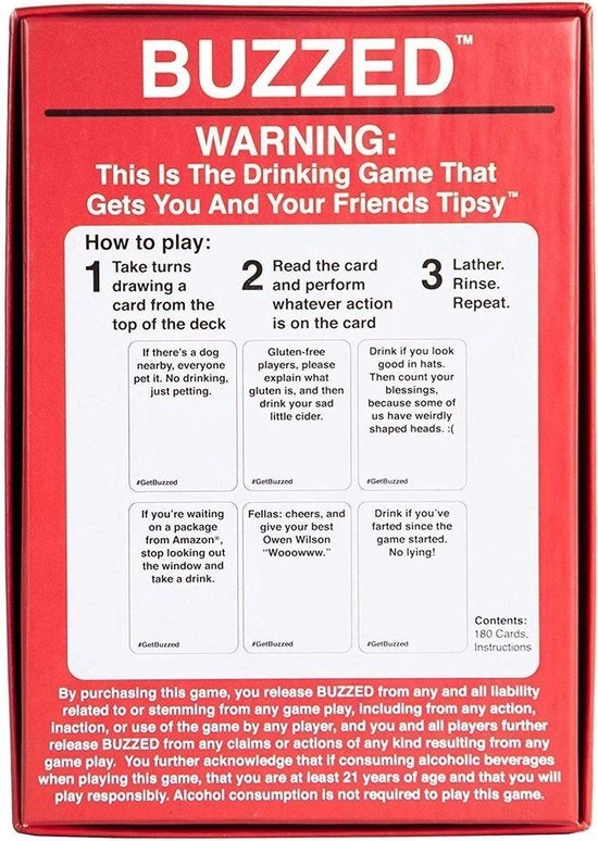 Dit is het uitbereiding pakket van buzzed drankspel, ontworpen voor mensen vanaf 18 jaar. Drink met mate! Hoe werkt het? Het is eenvoudig: om de beurt trek je een kaart vanaf de bovenkant van het kaartspel. Als je aan de beurt bent, lees je de kaart hardop en drink je op basis van de opdracht op de kaart, de kans is groot dat je snel al heel wat drankjes hebt gedronken.