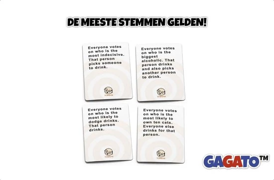 Zorg dat de drank koud staat en reserveer alvast een taxi. De kans is groot dat je liever niet op eigen gelegenheid naar huis gaat vanavond. Dit wordt een avond die je niet snel zult vergeten. Bereid je voor om te concurreren, te stemmen en je vrienden voor de gek te houden met de hilarische drinkspel!