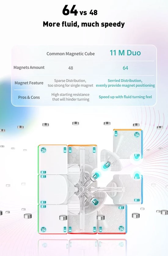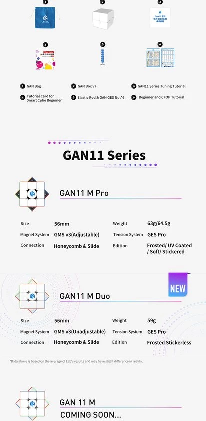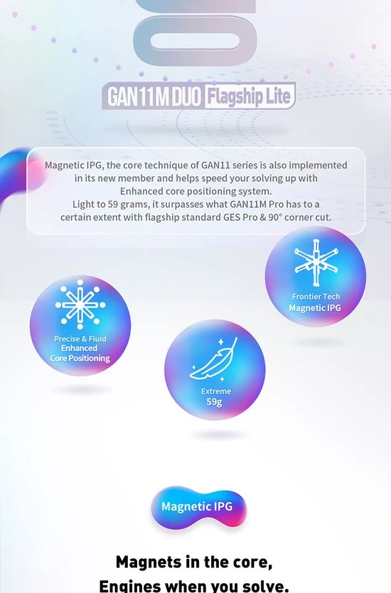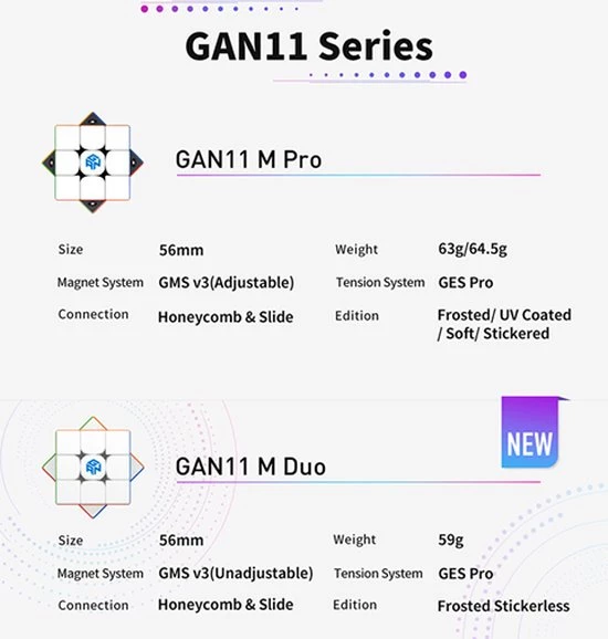 De GAN 11 M Duo 3?3 is een nieuwe, meer betaalbare variant van de populaire GAN 11 M Pro. De Duo is in alle opzichten identiek aan de Pro, behalve dat de Duo geen verstelbare magneten heeft. Het resultaat is een ultralichte kubus van 60 gr, alleen goedkoper.