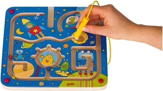 Houten speelgoed is duurzaam, veilig maar vooral heel erg leuk! Wat dacht je van deze houten labyrint puzzel van Goki? Het doel is om de kleine balletjes te navigeren in het heelal. Dit kan doordat het bord magnetisch is.