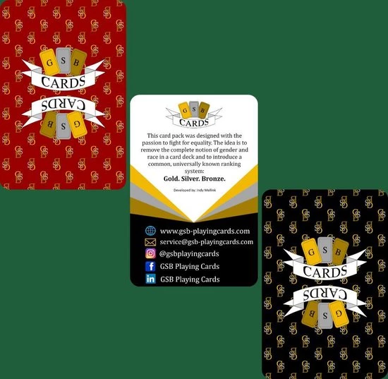 GSB staat voor Gold, Silver en Bronze. Het idee is om in een kaartspel geen onderscheid meer te maken tussen geslacht en ras. Waarom zou de Heer een hogere positie moeten hebben dan de Vrouw? Waarom zijn de Heer, de Vrouw en de Boer wit? Hoe dan ook, we wilden de discussie niet ingewikkelder maken dan dat deze is. Daarom hebben we besloten om de gender- en rassenfactor als geheel te schrappen en een universeel, algemeen geaccepteerd classificatiesysteem in te voeren. We gaan voor het gender- en rasneutrale Gold, Silver en Bronze.