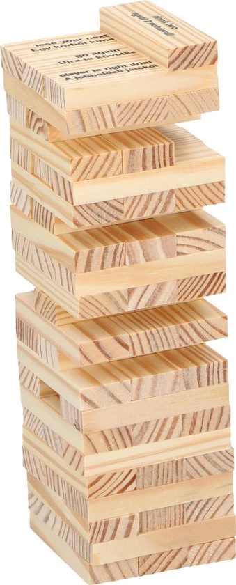 Neem om beurten een blokje uit de toren zonder hem om te laten vallen. Bij elk uitgehaalde steen moeten jullie een andere opdracht uitvoeren.