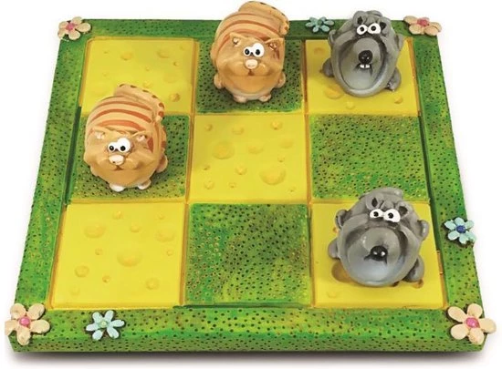 Exclusief, decoratief en leuk boter kaas en eieren spel met kat en muis. Handgemaakt en geschilderd door Paolo Chiari en alleen verkrijgbaar bij HGH Woondeco. Afmetingen 11,5×11,5×4 cm