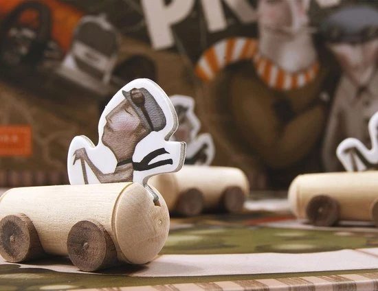 Inhoud van het spel: spelbord, 5 x 6 kaarten, 5 houten auto’s met coureur, 5 hindernissen, 1 beker