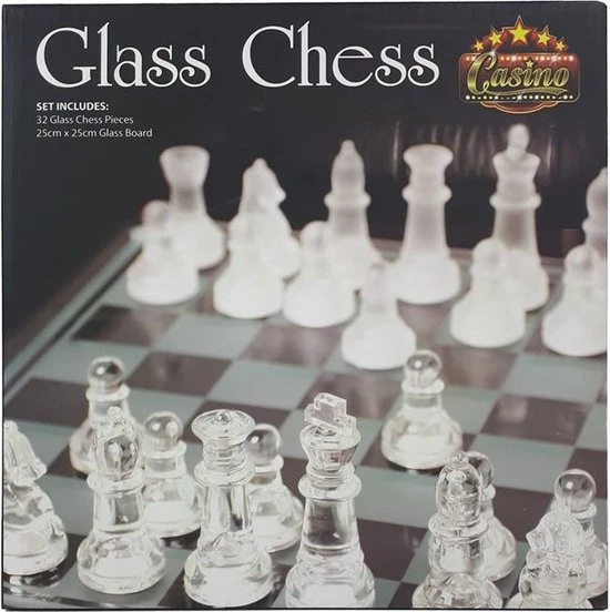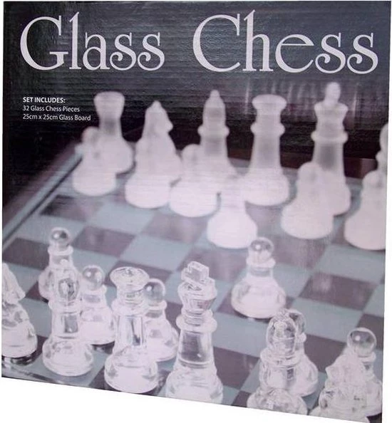 Glazen schaakspel 25x25cm: Glazen schaakspel met matte en glanzende schaakstukken. 33-dlg incl. glazen bord 25x25cm.