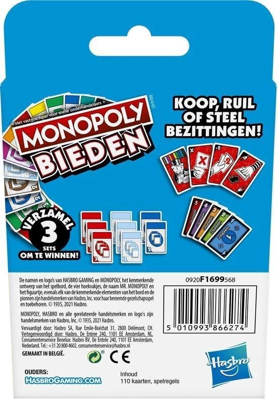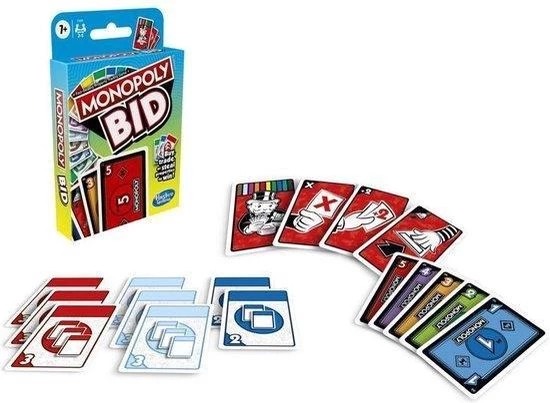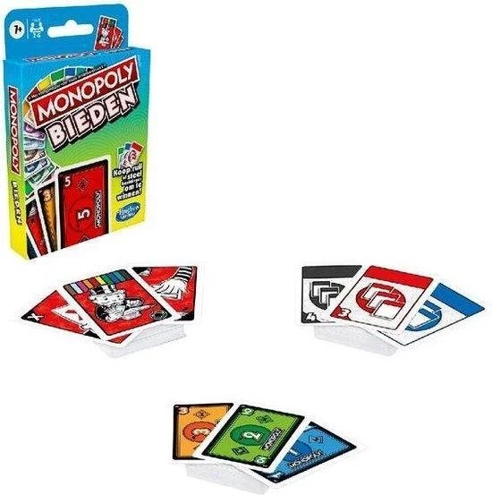 Ben je klaar voor een spannend Monopoly-kaartspel dat niet lang duurt? Het Monopoly Bieden kaartspel is een combinatie van toeval, geluk en strategie waarbij spelers bieden in blinde veilingen, betalen met geldkaarten, eigendommen stelen met actiekaarten en hun geluk doen keren met jokers. Tijdens de speelrondes krijgt iedereen de kans om een veiling te organiseren. Wanneer het tijd is om op een eigendom te bieden, kiezen spelers hoeveel geld ze willen riskeren. Dan roept iedereen: ?1, 2, 3, Bieden!? en leggen ze hun geldkaarten neer. De speler die het meeste geld heeft geboden, krijgt de eigendom.