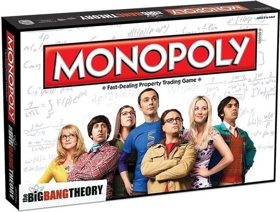 Bazinga! Een speciale Monopoly editie rondom de succesvolle tv-serie The Big Bang Theory. Reis door de straten van Pasadena, koop het apartement van Sheldon en Leonard of koop het huis van Mrs. Wolowitz. Waan jezelf in de wereld der wetenschap met je favoriete tv nerds! Monopoly The Big Bang Theory bevat 7 unieke speelstukken van kenmerkende elementen uit de serie, zoals de bril van Leonard, de sofa van Sheldon, de astronautenhelm van Howard, hond Cinnamon van Raj, het wijnglas van Penny, de tiara van Amy en de microscoop van Bernadette.