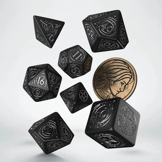 En een metalen munt met de afbeelding van Yennefer, die fungeert als een D2. Elke dobbelsteen is zwart gekleurd met zilvergekleurde gravures. De gezichten met de hoogste waarde en de omgekeerde munt delen afbeeldingen met de hanger van Yennefer, een pentagram.