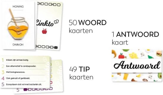 Probeer samen met je medespelers om de juiste Tipkaart te verbinden met de Woordkaarten. Is de resterende woordkaart de sleutel die je zoekt, of zijn de links die jullie hebben gelegd niet juist? Linkto wordt direct beschikbaar in twee versies, namelijk LINKTO ETEN en LINKTO REIZEN! Waar de variant ETEN zich richt op feitjes over etenswaren, is de variant REIZEN meer gericht op informatie over bijzondere locaties Alleen het thema van beide spellen is anders, de regels zijn gelijk.