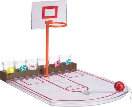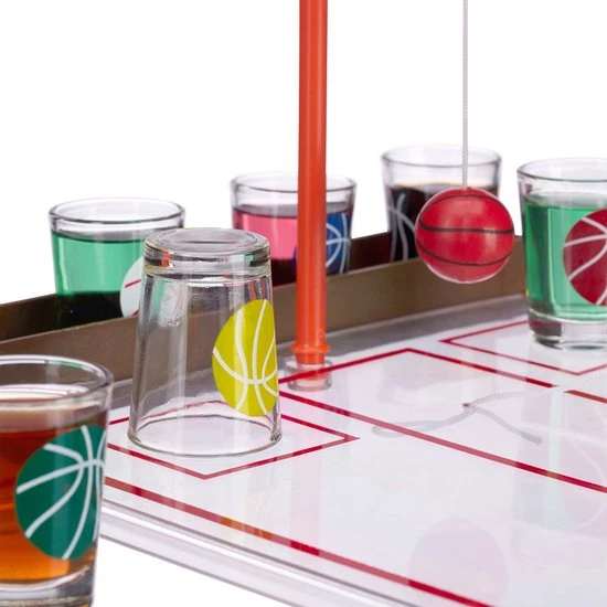 Met het originele drinkspel wordt elk feestje tot een onvergetelijke avond! Op een miniatuur basketbalveld speel je in een leuke ronde spannende wedstrijden! Bewijs je behendigheid en gooi de bal door de ring. Of de winnaar of de verliezer een shotje uit de kleurrijk bedrukte glazen moet drinken, bepaal jij! Jij bepaald de regels. Zo heb je geheid veel feestplezier!