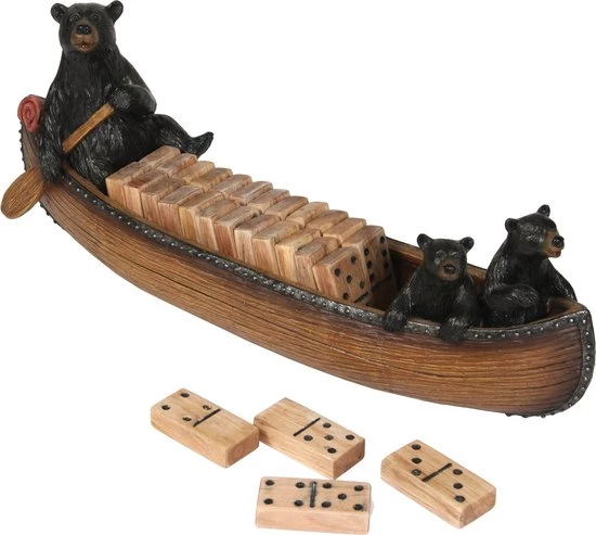 Deze dominoset is een handgeschilderde polyhars kano met een zwarte beer die haar twee welpen peddelt. In de kano zit een houten domino set welke meegeleverd wordt. Deze dominoset is een perfect cadeau-idee voor elke dominoliefhebber en accentueert elk interieur.