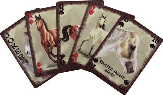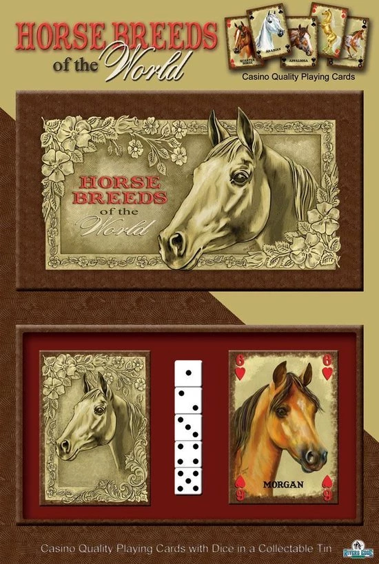 2 spellen van casino kwaliteitskaartjes en 5 dobbelstenen, in een aantrekkelijk gevulde cadeau-tin blik met reli?f deksel. Aantrekkelijk verpakt in een full color clam pack. Met een kunstwerk van Mary Bausman elk spel heeft afbeeldingen van 36 verschillende paardenrassen uit de hele wereld.