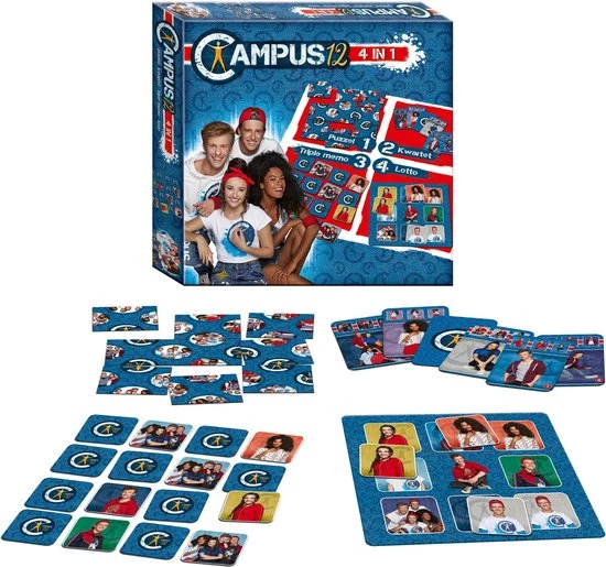 Met deze speldoos van Campus 12 zijn uren speelpret verzekerd! Daag je vrienden uit voor een partijtje triple memo, ga op zoek naar de juiste kaarten in het kwartet of probeer als eerste je spaarkaart vol te krijgen in de Campus 12 lotto. En als je dan nog niet genoeg kreeg van al dat spelen, leg dan de aartsmoeilijke puzzel die toch maar negen stukken heeft. Vier spellen in ??n doos, dat is vier keer zoveel pret!